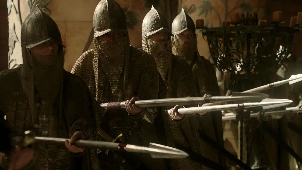 Quando viene portato nella sala del trono per il processo che lo vede come iniziato principale per la morte di re Joffrey Baratheon, Tyrion Lannister viene scortato da ser Addam e sei uomini della guardia cittadina, non dai cavalieri della Guardia Reale, molti dei quali testimonieranno contro di lui. Durante il processo, un centinaio di Cappe Dorate si trovano di guardia nella sala del trono.